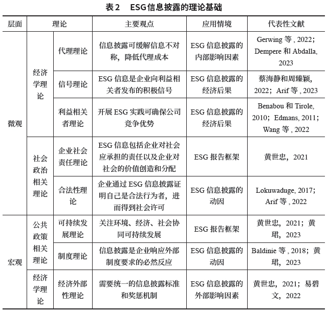 ESG信息披露的研究涉及多個學科的交叉融合,理論研究主要聚焦在微觀和宏觀兩個層面。微觀層面主要基于經濟學理論和社會政治相關理論對企業內部因素如治理結構、財務績效和風險管理等展開研究,宏觀層面主要基于公共政策相關理論和經濟外部性理論對企業外部因素如政治制度、勞動制度、文化制度等展開研究(表2)。