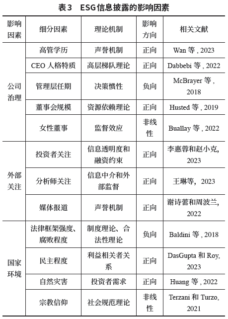 深入探究企業ESG信息披露的影響因素,識別各因素之間的作用關系,不僅可以幫助企業取得更好的ESG績效,更能幫助政策制定者起草ESG政策,激勵企業開展ESG實踐活動。因此,有關學者基于代理理論、合法性理論、利益相關者理論等,深入探討公司治理、外部關注、國家環境等因素對ESG信息披露的驅動作用,形成了一系列有價值的研究成果(表3)。