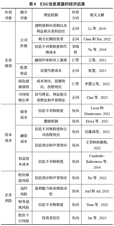 關于ESG信息披露作用效果的文獻大多集中于探討信息披露行為對微觀層面的企業績效、資本成本和企業風險的影響(表4)。