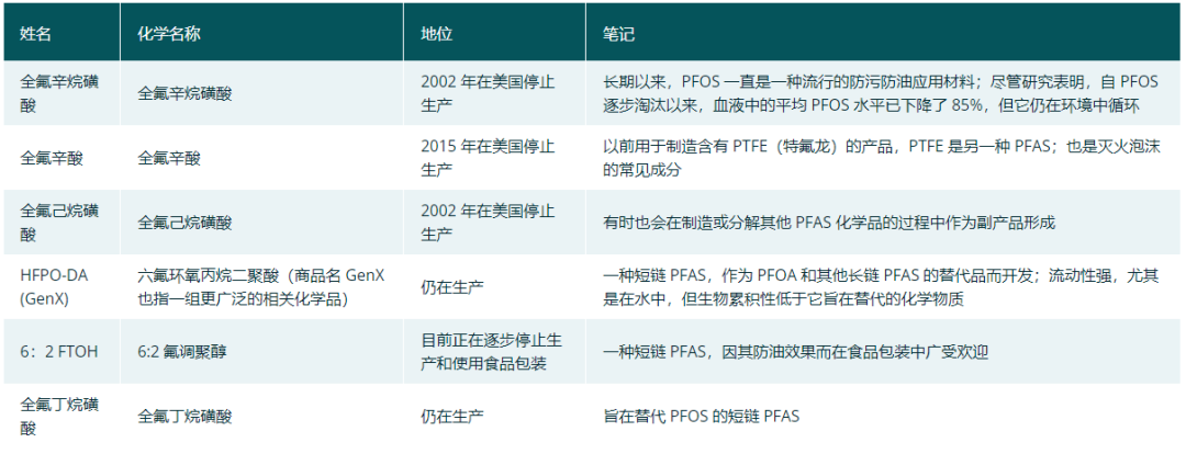美國環保局確定了超過12,000種單獨的PFAS化學物質。常見的例子包括氟代烴基醇(FTOH)、全氟辛酸(PFOA)和全氟辛烷磺酸(PFOS)。