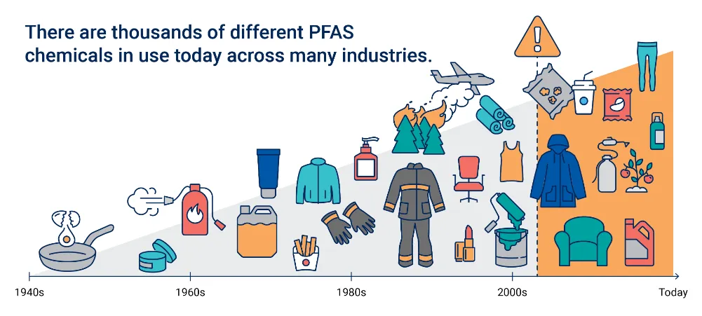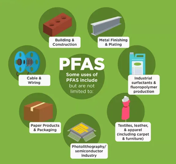PFAS被廣泛應用于多個領域,包括:工業制造:用于半導體、涂料和防火材料;消費品:如不粘鍋、戶外裝備和防水衣物;食品包裝:用于防油紙和包裝材料;消防泡沫:在消防行業中廣泛使用。
