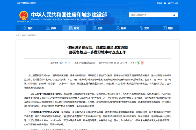 為認真貫徹落實黨中央、國務院決策部署,住建部、財政部近日聯合印發通知,部署各地加快落實增量政策措施要求,進一步做好城中村改造工作,推動符合條件的項目盡快啟動實施。10月17日,住房城鄉建設部部長倪虹在國務院新聞辦公室舉行的新聞發布會上,提出了“四個取消、四個降低、兩個增加”的政策“組合拳”,其中一個“增加”就是通過貨幣化安置等方式,新增實施100萬套城中村改造和危舊房改造。本次通知印發后,這項增量政策將加速落地。