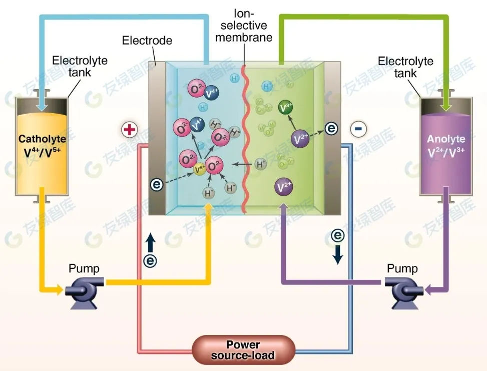 氧化還原液流電池可用作燃料電池或可充電電池。它們由兩個相互連接的儲罐組成,每個儲罐都包含電解質液體和帶相反電荷的電極,離子通過一個膜從一個儲罐傳遞到另一個儲罐。氧化還原液流電池的使用壽命比鋰電池更長,因為電流從一個儲罐流到另一個儲罐不會使膜降解。