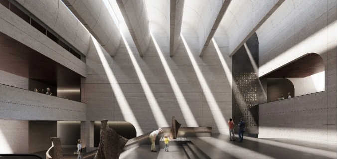呂梁是革命老區,曾是紅軍東征的主戰場,也是革命圣地延安的東部屏障。中部的革命歷史紀念館外表皮使用紅色穿孔鋁板,造型取自紅旗飄揚的形態,以體現革命歷史的不朽豐碑。紀念館對應的上方是一個圓形的開口,也呼應著中國古代天圓地方的哲學思想,一種陰陽協調、天人合一的宇宙觀。