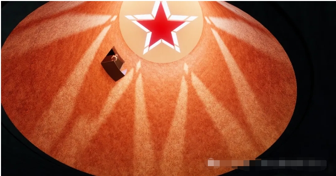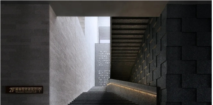 紀念館中廳同樣運用光影來塑造空間,同時將紅色元素融入其中,營造出一個神圣,崇高的紀念性場所。