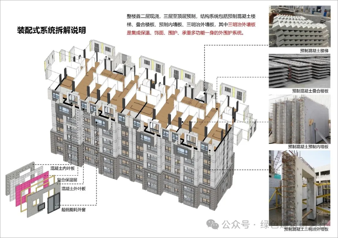 住宅樓部分采用裝配整體式鋼筋混凝土剪力墻結(jié)構(gòu)體系,地上三層及以上進(jìn)行預(yù)制,采用預(yù)制混凝土夾心外墻板系統(tǒng)(PC 三明治板)、預(yù)制疊合樓板、預(yù)制疊合陽(yáng)臺(tái)板、全預(yù)制空調(diào)板、預(yù)制樓梯、預(yù)制女兒墻等。住宅樓外圍護(hù)體系主體部分采用預(yù)制混凝土三明治板系統(tǒng)。首、二層現(xiàn)澆部分采用幕墻系統(tǒng),均滿足圍護(hù)保溫裝飾一體化設(shè)計(jì)。戶內(nèi)隔墻采用輕鋼龍骨隔墻,為非砌筑墻體。采用全裝修設(shè)計(jì),公區(qū)采用干式工法,戶內(nèi)采用干式工法地面、輕鋼龍骨隔墻、集成廚房、集成衛(wèi)生間及機(jī)電管線分離等系統(tǒng)和技術(shù)。