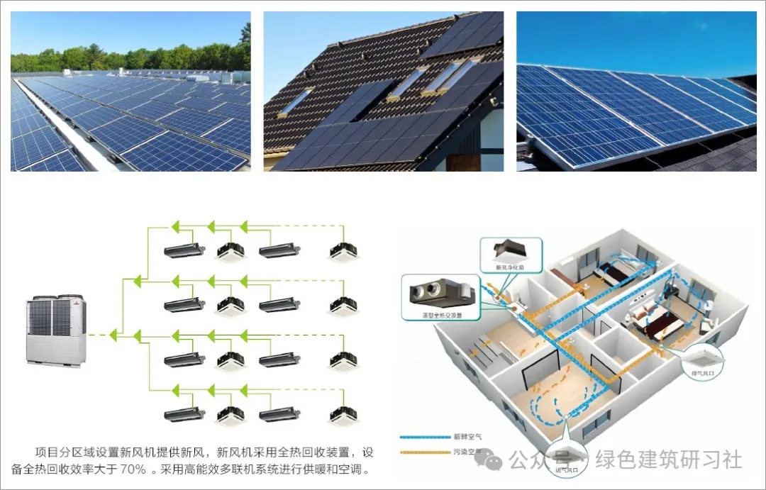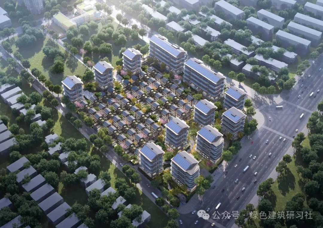 項(xiàng)目共有7棟住宅和1所幼兒園采用超低能耗技術(shù)。利用可再生能源,屋面或立面設(shè)置光伏發(fā)電板,光伏板面積不少于住宅屋面水平投影面積的40%。幼兒園可再生能源利用量滿足近零能耗建筑要求。