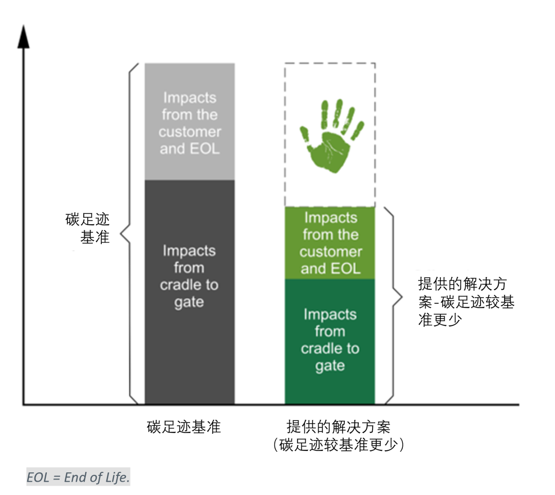 企業可以通過提供比基線解決方案碳足跡更小的解決方案(圖中提供的解決方案中的青綠色條)或幫助用戶減少產品使用過程中產生的碳足跡(圖中的綠色條)或兩者兼而有之來創建碳手印。比如,采用低排放生產的食品包裝解決方案,與標準包裝相比,它有助于延長食品的保質期,從而防止食品浪費。