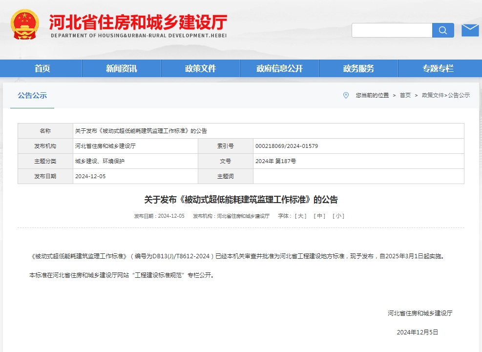 2024年12月5日,河北省住房和城鄉建設廳公告:《超低能耗建筑節能工程施工及質量驗收標準》(編號為DB13(J)/T 8608-2024)已經本機關審查并批準為河北省工程建設地方標準,現予發布,自2025年3月1日起實施。
