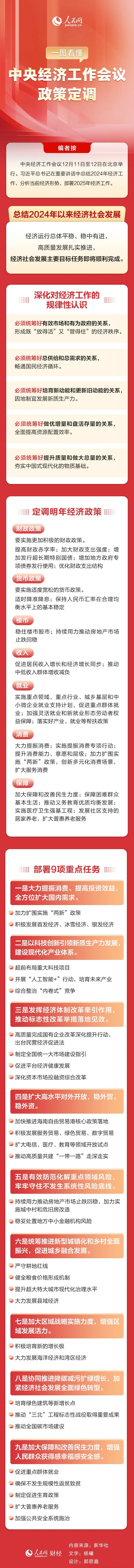 會議強調,做好明年經濟工作,要以習近平新時代中國特色社會主義思想為指導,全面貫徹落實黨的二十大和二十屆二中、三中全會精神,堅持穩中求進工作總基調,完整準確全面貫徹新發展理念,加快構建新發展格局,扎實推動高質量發展,進一步全面深化改革,擴大高水平對外開放,建設現代化產業體系,更好統籌發展和安全,實施更加積極有為的宏觀政策,擴大國內需求,推動科技創新和產業創新融合發展,穩住樓市股市,防范化解重點領域風險和外部沖擊,穩定預期、激發活力,推動經濟持續回升向好,不斷提高人民生活水平,保持社會和諧穩定,高質量完成“十四五”規劃目標任務,為實現“十五五”良好開局打牢基礎。