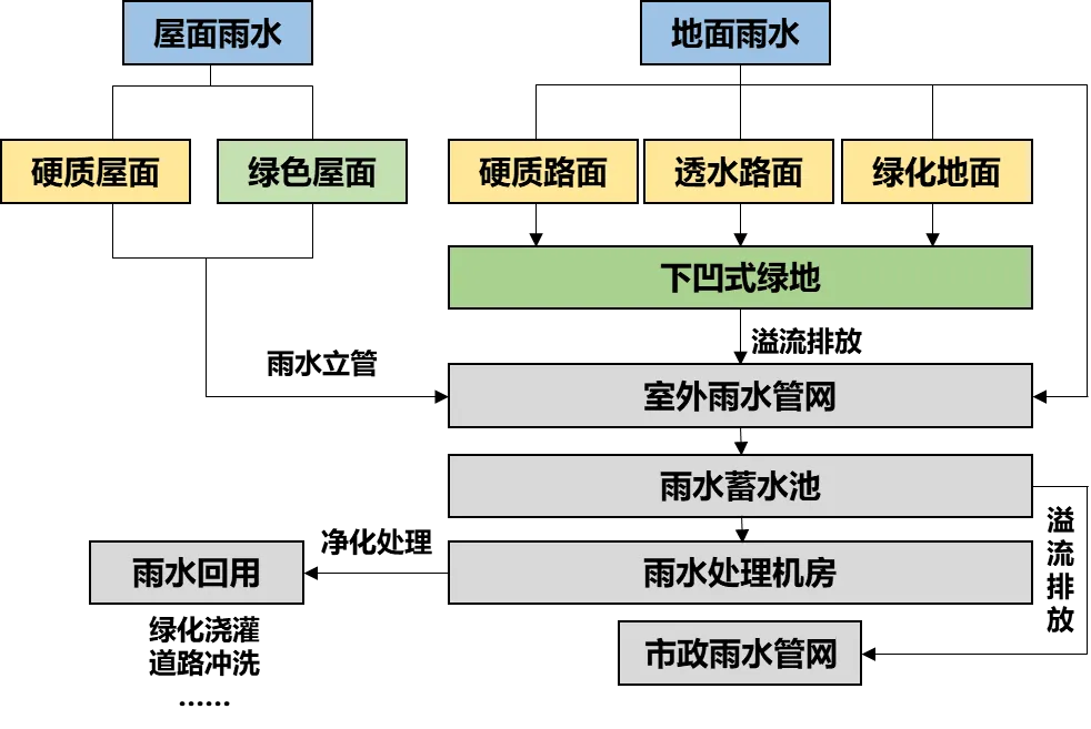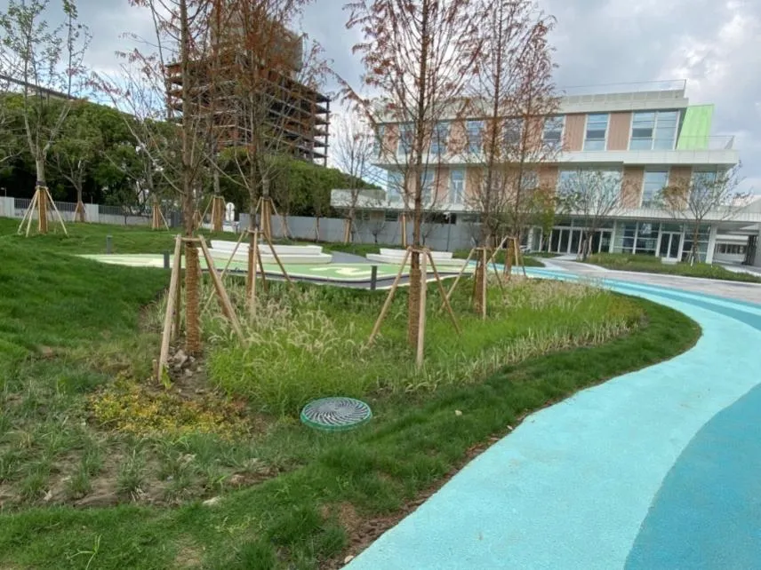 上海市實驗學(xué)校嘉定新城分校項目充分結(jié)合景觀效果與場地條件,通過設(shè)置綠色屋頂、透水鋪裝、下凹式綠地、雨水蓄水池等措施控制場地雨水徑流,減少面源污染,提升雨水資源利用率。項目共有2個排水分區(qū),依據(jù)下墊面及場地豎向設(shè)計、雨水管網(wǎng)分布等條件,共計劃分7個匯水分區(qū),項目總調(diào)蓄容積可達(dá)690.7立方米,最終可滿足年徑流總量控制率73%、年徑流污染控制率60%的目標(biāo)要求。