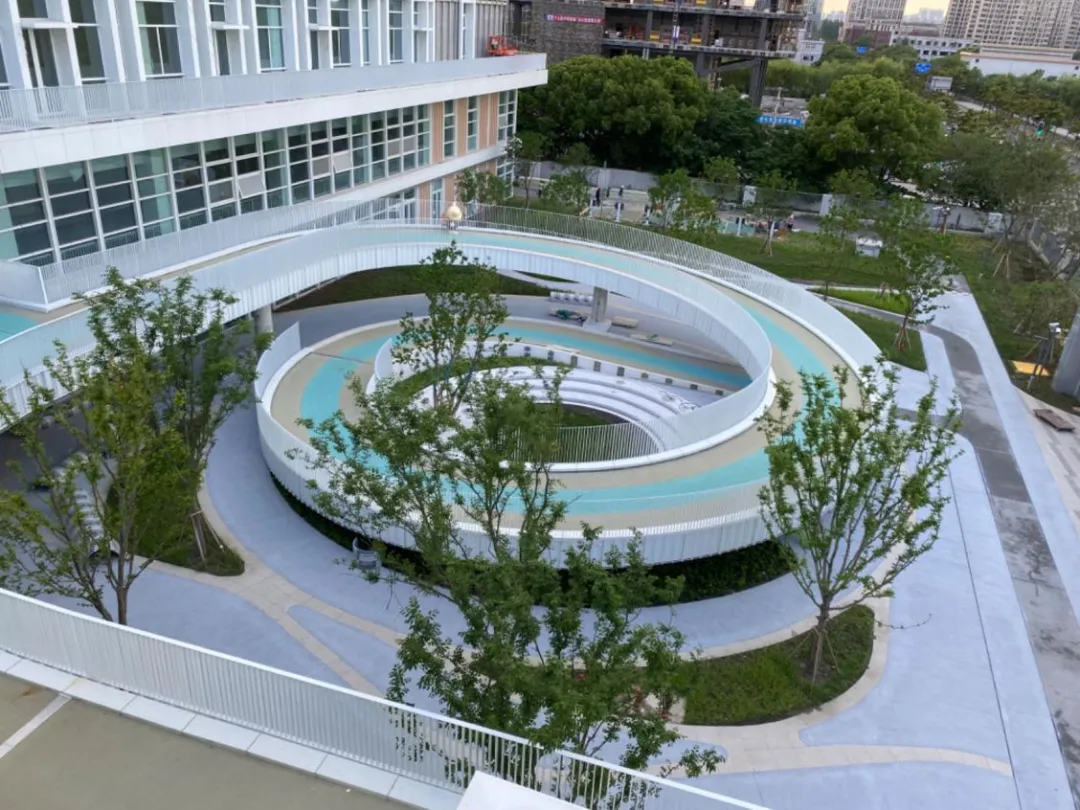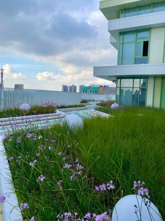 項目共計設(shè)置6521.2平方米的綠色屋頂,占建筑屋面總面積的30%,不僅可以吸收、削減雨水徑流,減輕排水管網(wǎng)壓力,還可以改善區(qū)域微氣候環(huán)境,緩解熱島效應(yīng)、降低周圍環(huán)境的噪音污染。搭配兒童游樂設(shè)施的綠色屋頂成為了師生課間休閑放松的天然氧吧,為學(xué)校師生提供了更健康的學(xué)習(xí)生活環(huán)境。