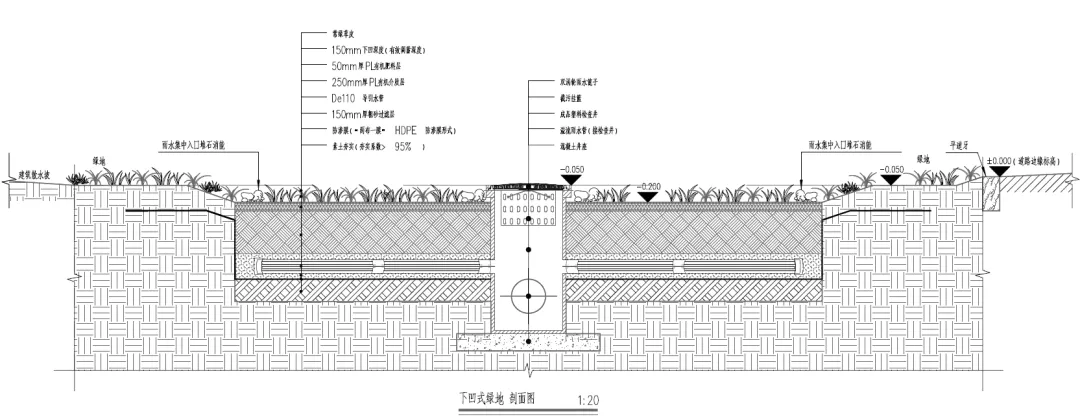 項目沿路分散設(shè)置共計430.5平方米的下凹式綠地,通過微地形設(shè)計收集周邊道路場地雨水徑流,收集的雨水通過內(nèi)部種植土過濾、凈化后下滲,超標(biāo)雨水通過設(shè)施內(nèi)溢流雨水井排入室外雨水管網(wǎng)。巧妙地將景觀設(shè)計中的“旱溪”與海綿城市設(shè)計中的“下凹式綠地”結(jié)合起來,考慮植物花期、色彩、形態(tài)、質(zhì)地、季相等搭配,構(gòu)建了耐水濕的常綠海綿植物花境,保證下凹式綠地的觀賞性。