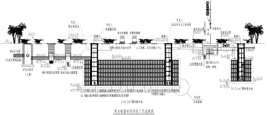 項目西地塊設(shè)有1處有效調(diào)蓄容積為200立方米的雨水蓄水池,東地塊設(shè)置1處有效調(diào)蓄容積為340立方米的雨水調(diào)蓄池,2個雨水調(diào)蓄池均位于地塊雨水管網(wǎng)末端,兼顧雨水調(diào)蓄與回用功能,收集雨水處理后回用于場地綠化澆灌等雜用。西地塊雨水資源利用率可達(dá)26.52%,東地塊可達(dá)31.62%。