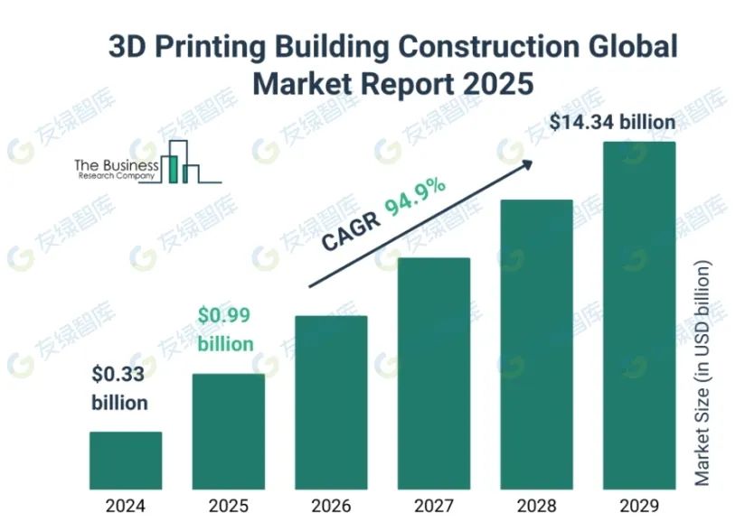 到 2029 年,3D 打印建筑施工市場預計將達到 143.4 億美元,復合年增長率為 94.9%。