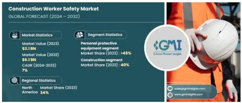 從建筑市場趨勢來看,2023 年工人安全市場價值 31 億美元,預計從 2024 年到 2032 年,在先進安全技術越來越多地采用的推動下,復合年增長率將超過 7%。
