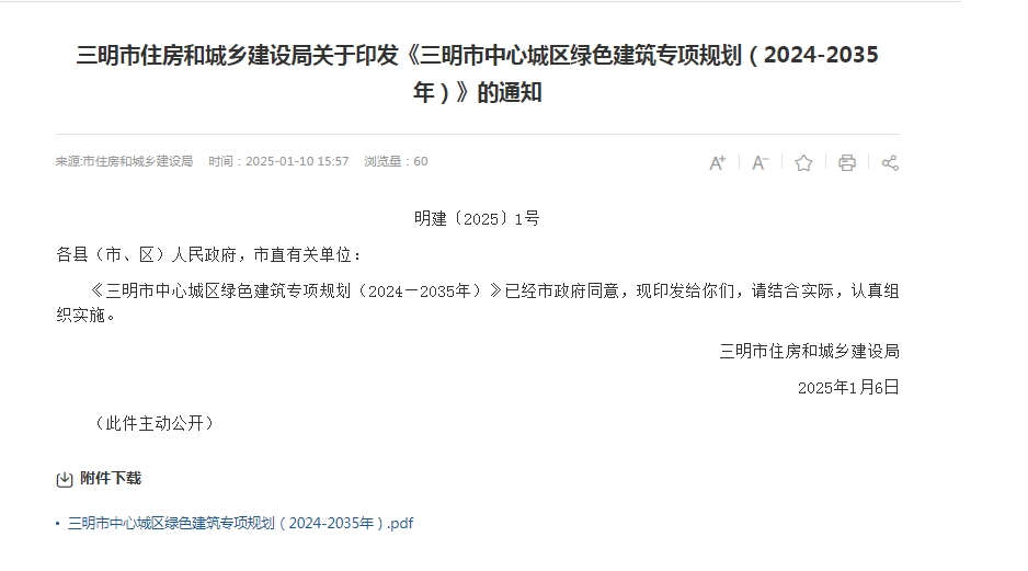 2025年1月6日,三明市住房和城鄉(xiāng)建設(shè)局印發(fā)《三明市中心城區(qū)綠色建筑專項(xiàng)規(guī)劃(2024-2035年)》。文件提出:至2030年,新建民用建筑中,居住建筑平均節(jié)能率達(dá)到68%, 公共建筑平均節(jié)能率達(dá)到75%;至2035年,新建民用建筑中,居住建筑平均節(jié)能率達(dá)到75%, 公共建筑平均節(jié)能率達(dá)到78%。