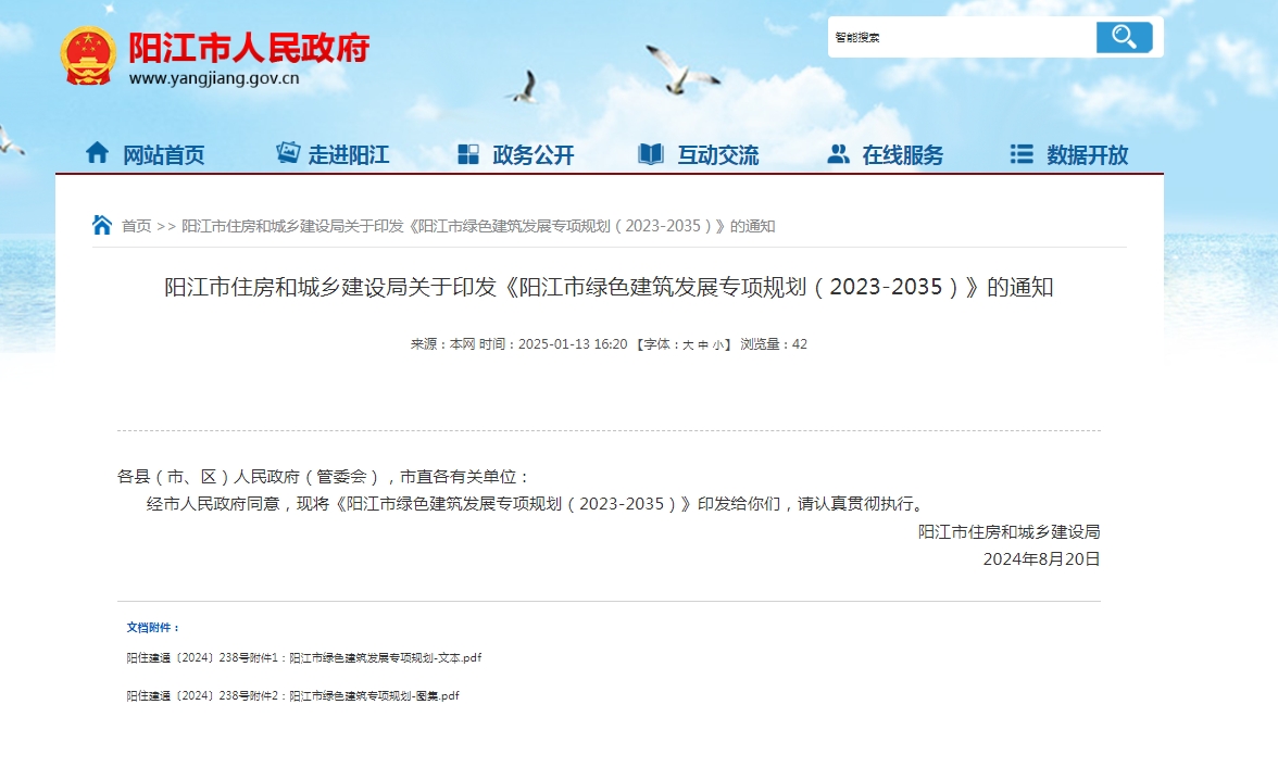 2025年1月13日,陽(yáng)江市住房和城鄉(xiāng)建設(shè)局發(fā)布《陽(yáng)江市綠色建筑發(fā)展專項(xiàng)規(guī)劃(2023-2035)》。