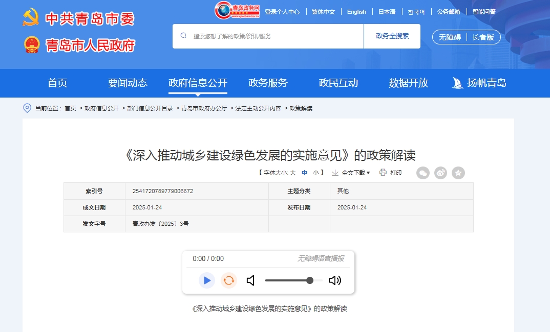 2025年1月24日,青島市人民政府辦公廳印發(fā)《關(guān)于深入推動(dòng)城鄉(xiāng)建設(shè)綠色發(fā)展的實(shí)施意見(jiàn)》(青政辦發(fā)〔2025〕3號(hào))。