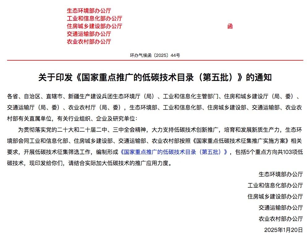 時間:2025-02-20 15:39:46 作者:GBWindows 來源:行業網站 閱讀:504內容摘要:2月12日,生態環境部官網消息,生態環境部會同工業和信息化部、住房城鄉建設部、交通運輸部、農業農村部共同印發《國家重點推廣的低碳技術目錄(第五批)》。據了解,《國家重點推廣的低碳技術目錄(第五批)》包括5個重點方向共103項低碳技術。其中,能源綠色低碳轉型類20項;重點領域降碳類......2月12日,生態環境部官網消息,生態環境部會同工業和信息化部、住房城鄉建設部、交通運輸部、農業農村部共同印發《國家重點推廣的低碳技術目錄(第五批)》。
