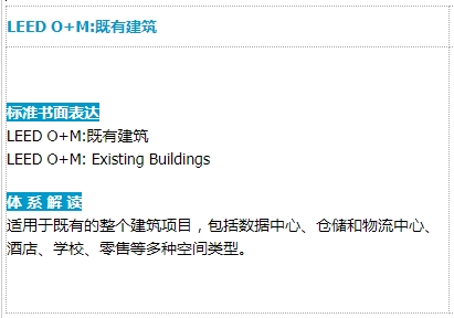 什么是LEED? LEED O+M(LEED for Building Operations and Maintenance)即 LEED 建筑運(yùn)營與維護(hù),針對旨在通過較少改造來達(dá)到建筑性能優(yōu)化的既有建筑開發(fā)的評級系統(tǒng)。許多舊樓宇是耗能和耗水大戶,但拆除重建對環(huán)境的影響更甚。LEED O+M 評級體系的應(yīng)用可以讓這些老建筑重?zé)ㄐ律@套評級體系可以應(yīng)用在既有建筑、零售、學(xué)校、酒店、數(shù)據(jù)中心、倉儲(chǔ)和物流中心等多個(gè)細(xì)分市場。