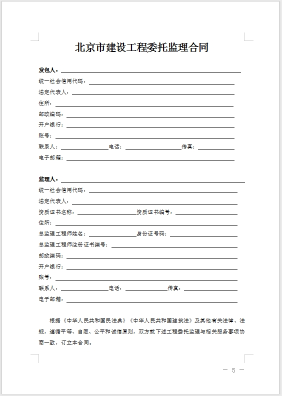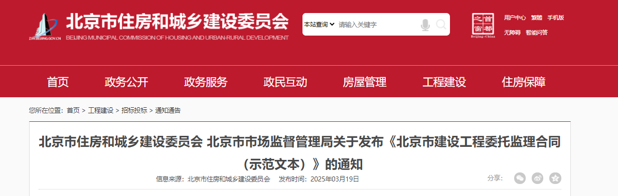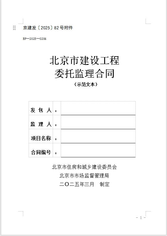為解決北京市建設工程監理行業目前存在的問題,引導行業良性發展,進一步規范北京市建設工程監理市場行為,創造公平、有序的市場環境,促進監理行業持續健康發展,依據《中華人民共和國民法典》《中華人民共和國招標投標法》《中華人民共和國安全生產法》《建設工程質量管理條例》等相關法律法規,北京市住房和城鄉建設委員會會同北京市市場監督管理局制定了《北京市建設工程委托監理合同(示范文本)》(BF——2025——0206,以下簡稱“示范文本”),現就有關事項通知如下: