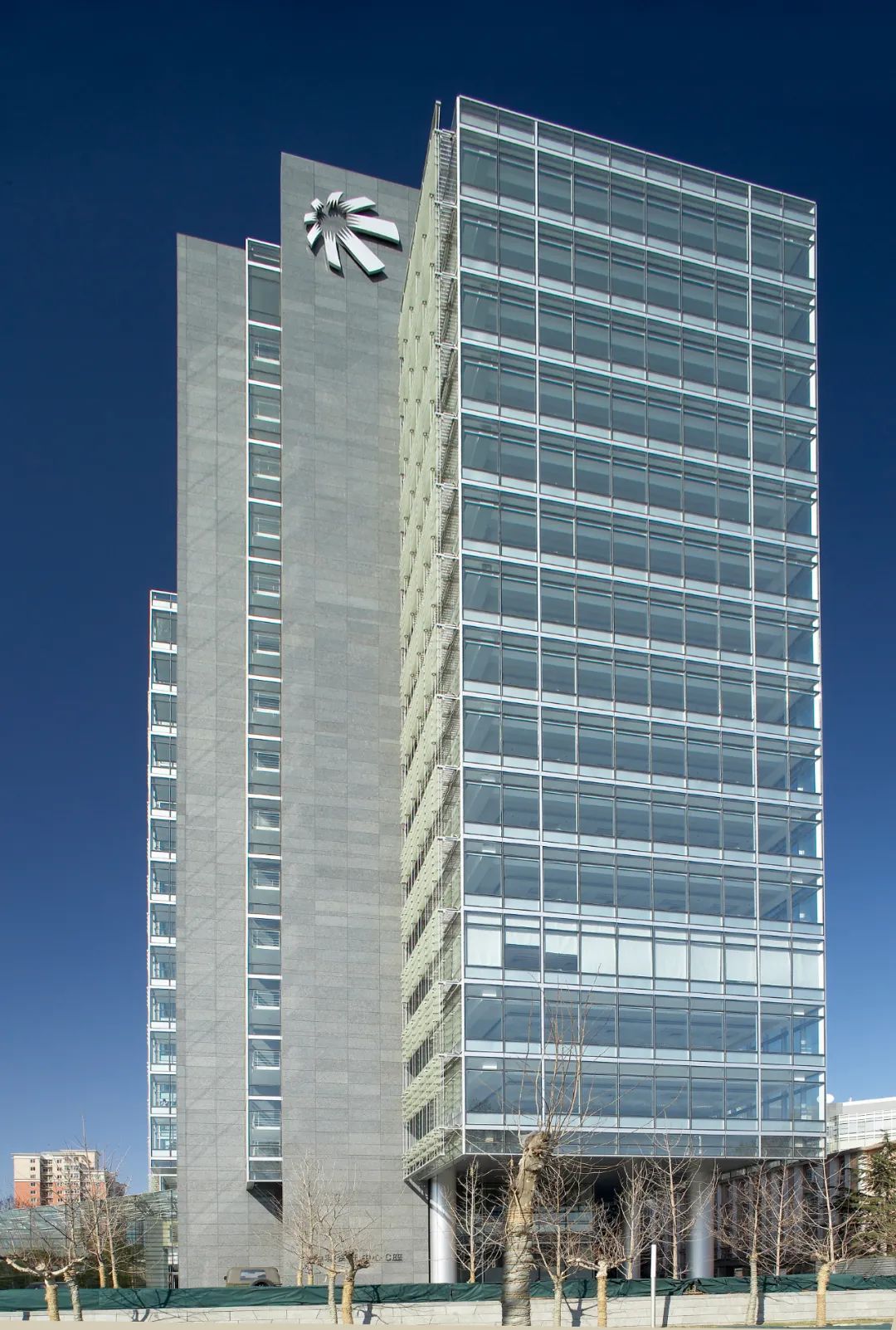 辦公樓東側從三層起向東懸挑9米,采用斜拉索,營造三面采光、開敞通透的辦公環境。西側及十七層采用雙層呼吸幕墻,節約能源。南側采用水平絲網印刷玻璃遮陽板,遮擋直射光及眩光。