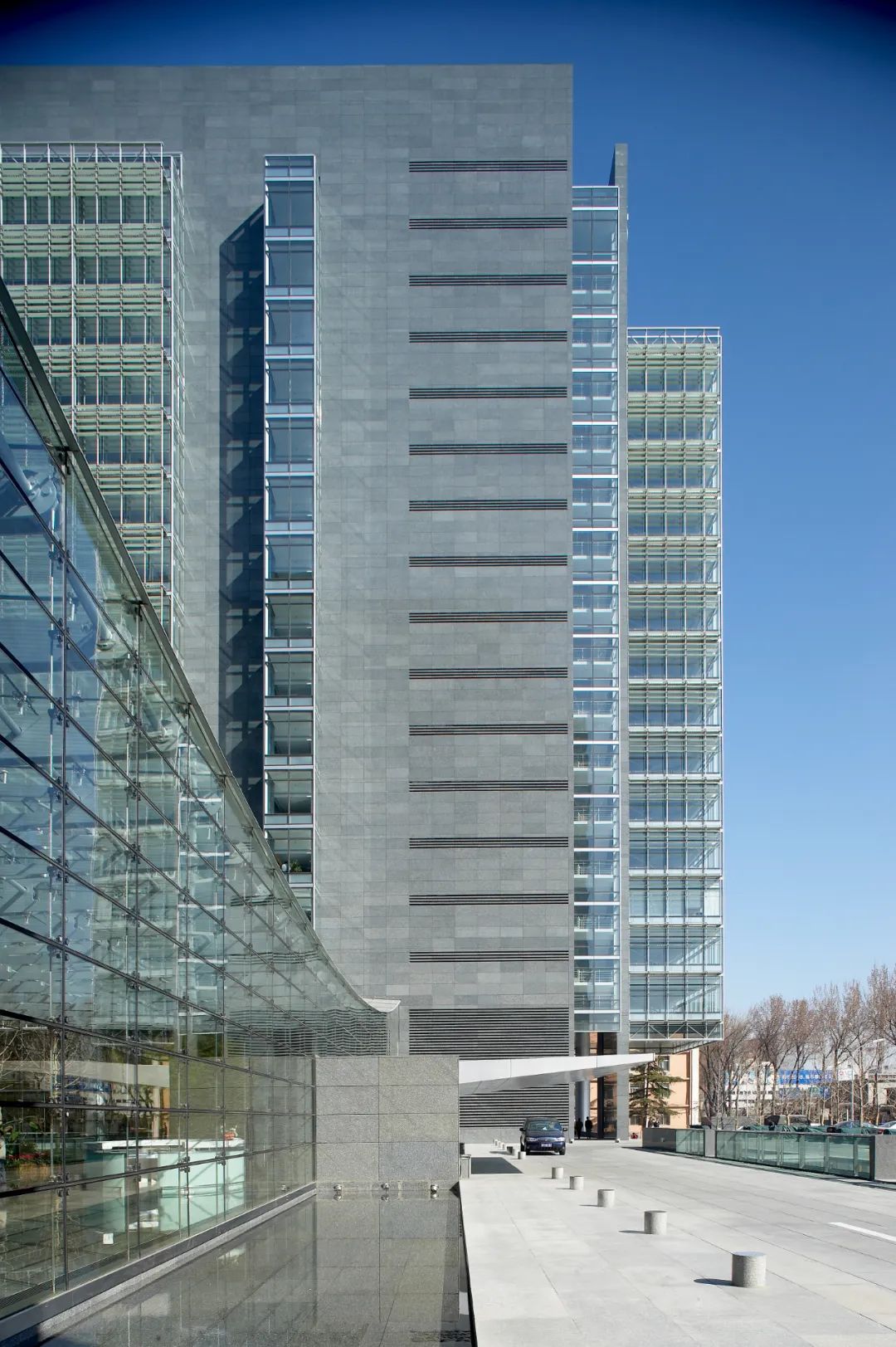 在完成融科資訊中心C座的設計后,北京建院設計團隊也完成了D座的設計工作。D座建筑延續了現代建筑的設計手法,采用了與之相同的灰黑色花崗巖、玻璃幕墻等建筑材料,在方整造型上,以片墻穿插。建成后,整個園區呈現出統一、和諧的現代建筑風格,得到了多方的認可和好評。