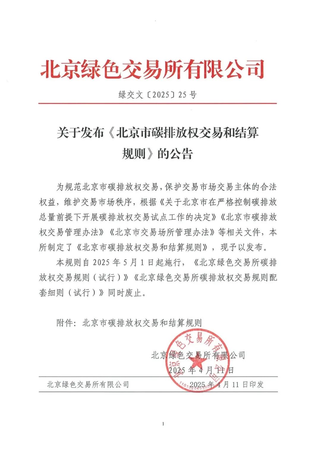 本規則自2025年5月1日起施行,《北京綠色交易所碳排放權交易規則(試行)》《北京綠色交易所碳排放權交易規則配套細則(試行)》同時廢止。