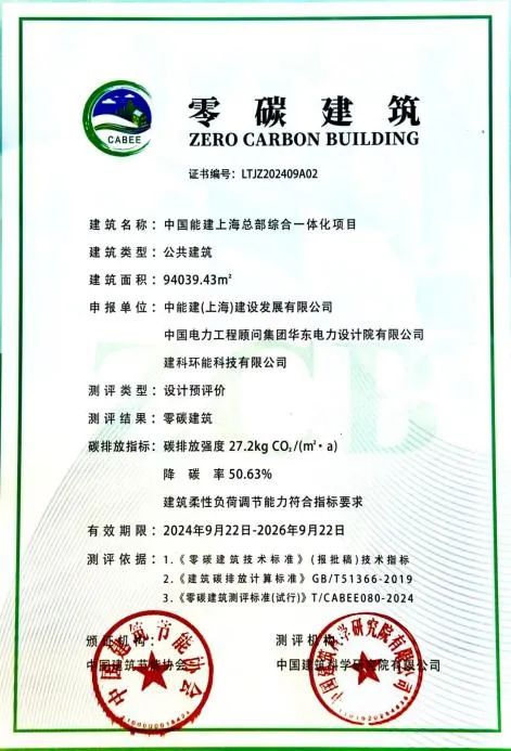 項目建成后年綜合節能率可達60.85%,每年可再生能源發電量122萬千瓦時以上,滿足樓宇大部分用電需求,負荷可調比例將達38%以上,未來將具備電網柔性協同能力,在新型電力系統建設中具有重要意義?。項目已獲得中國首批零碳建筑認證和近零能耗建筑認證。