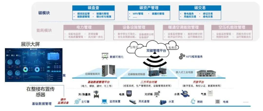 精管控——智慧能碳系統 項目設置智慧能源與碳排放管理系統,對項目中多種形式的資源與能源進行分項精確計量,能夠統計項目的能耗情況與產能情況,發布碳排放數據,實時反饋各種用能設備的狀態,快速發現異常狀況,及時提醒,保證其良好運行。通過布置先進傳感器與算法,還能夠準確預測第二天負荷情況,對冷熱源及暖通設備進行優化設置,提高運行效率,達到高效機房標準。