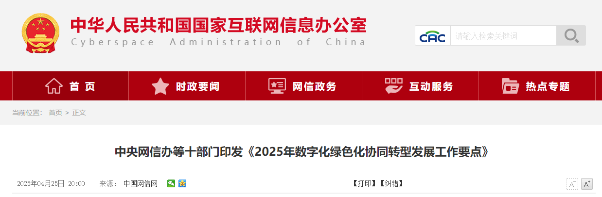 中央網信辦等十部門印發《2025年數字化綠色化協同轉型發展工作要點》