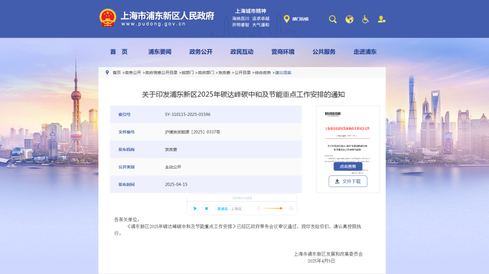 上海發布《浦東新區2025年碳達峰碳中和及節能重點工作安排》