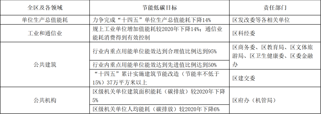 2025年新區碳達峰碳中和及節能降碳計劃目標是:力爭完成“十四五”單位增加值能耗(考核口徑[1])同比下降14%的目標任務,完成市下達的產業結構調整、節能技改、建筑節能、公共機構節能等重點領域工作任務。