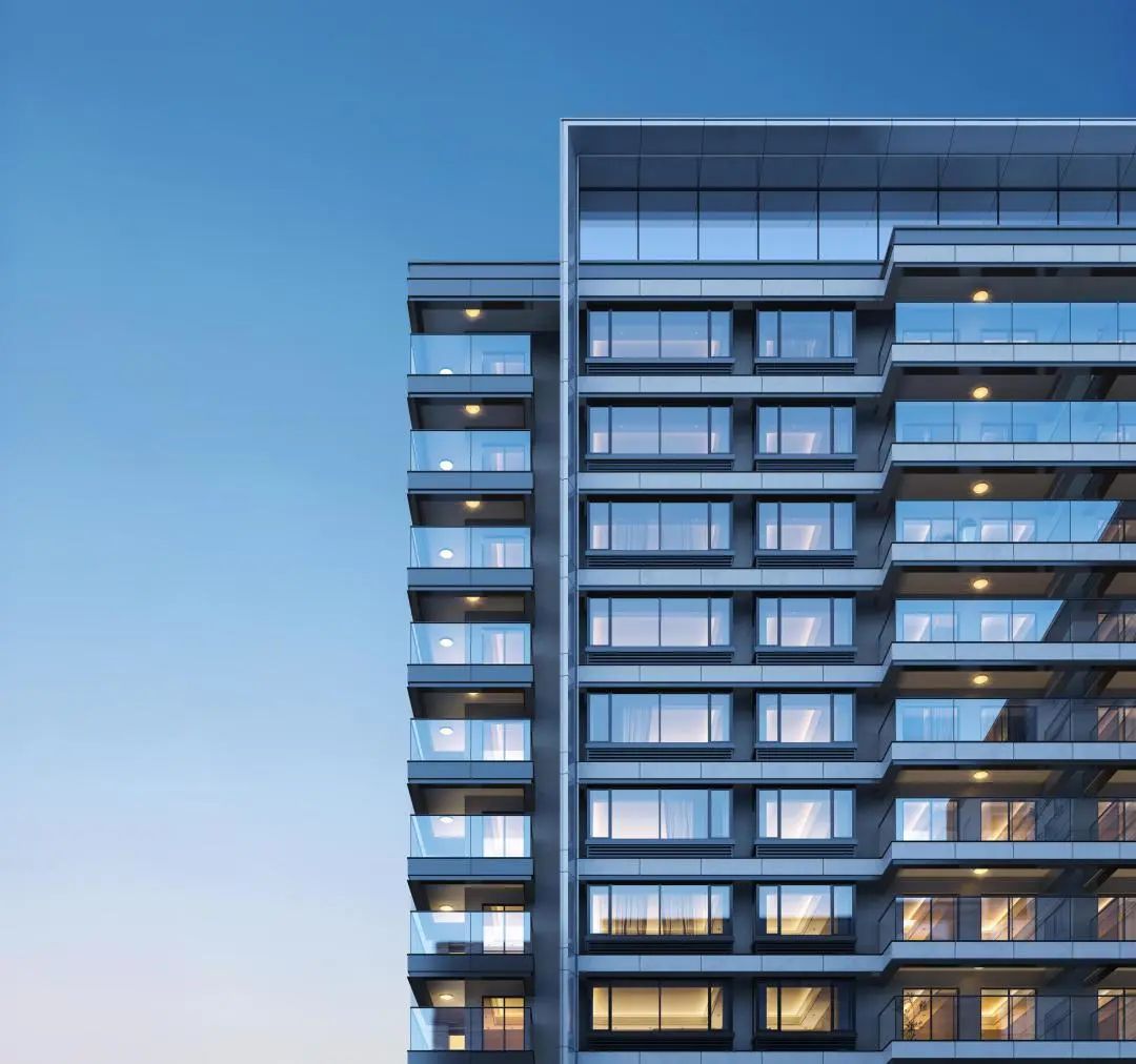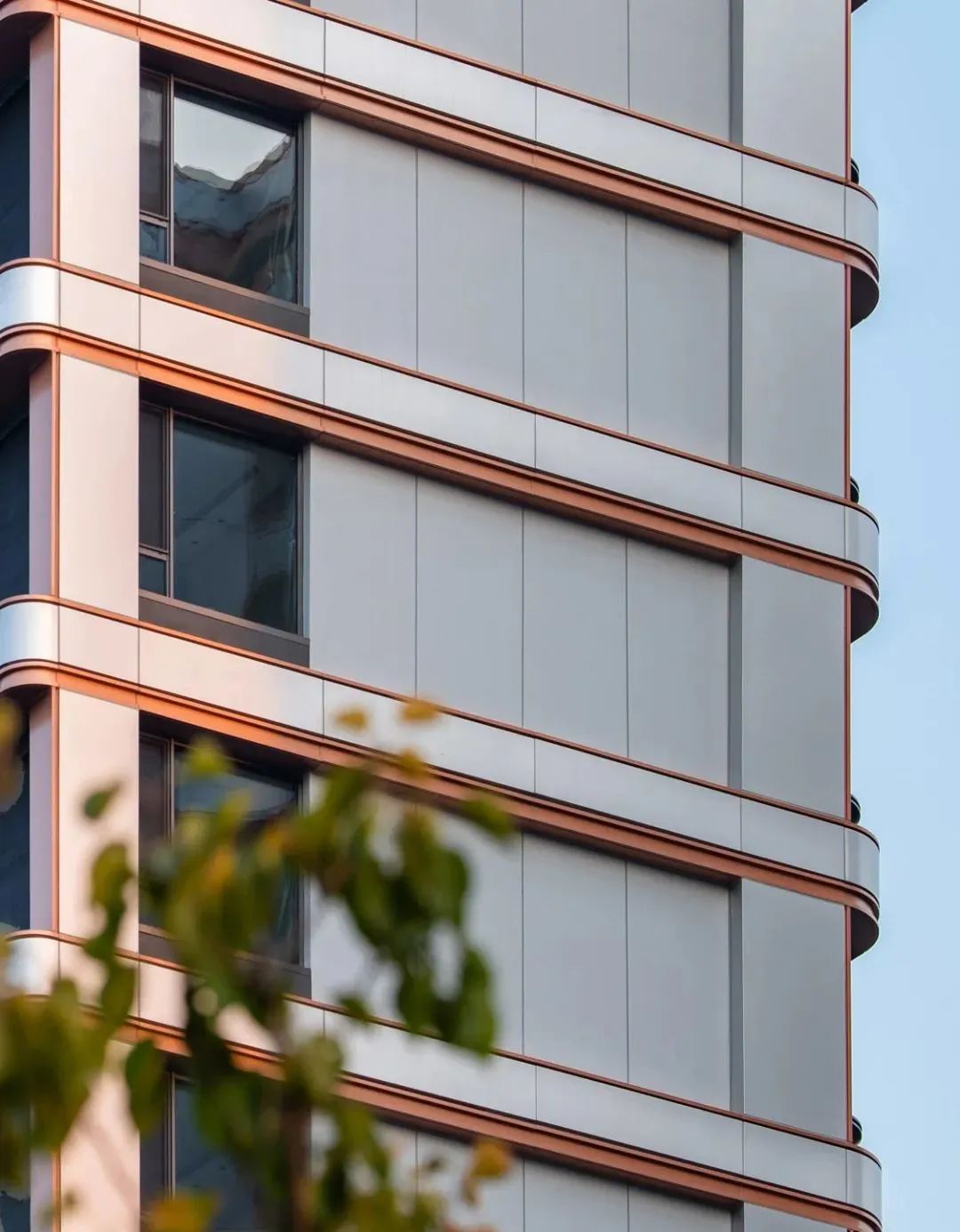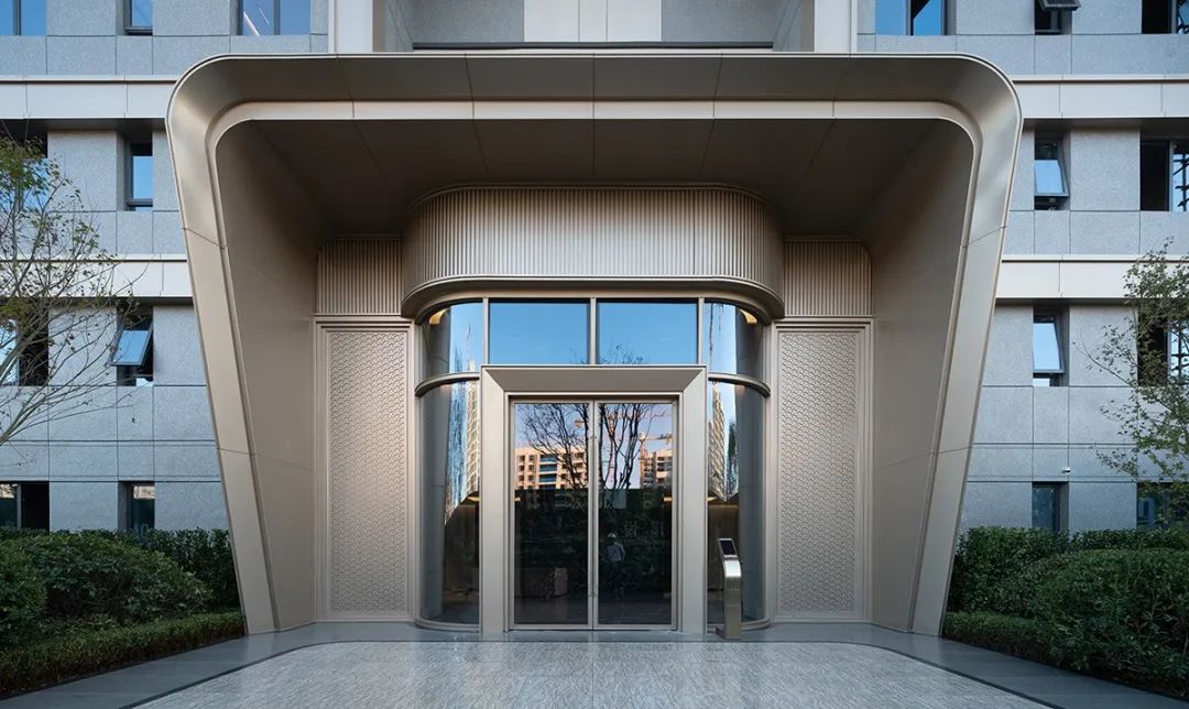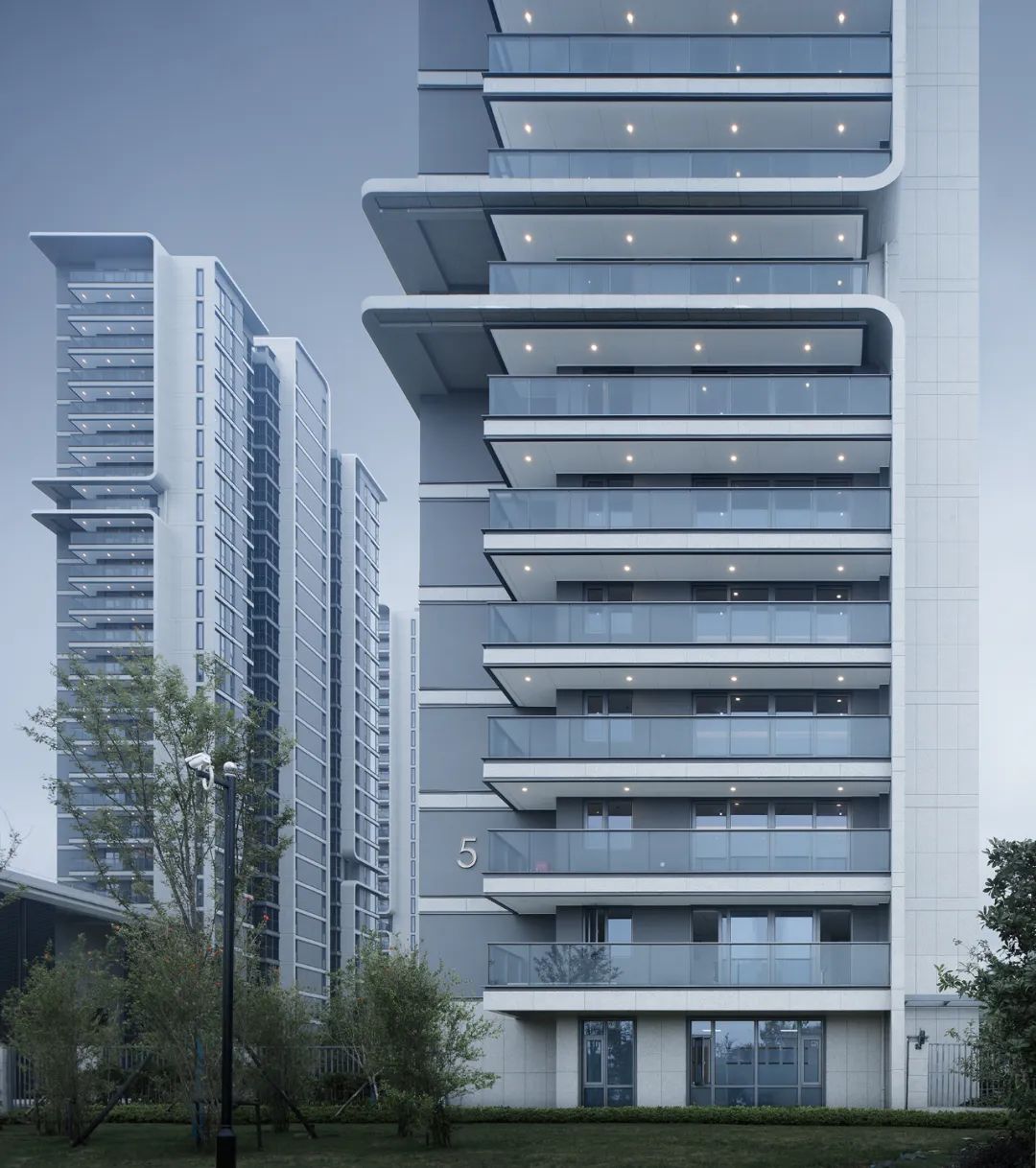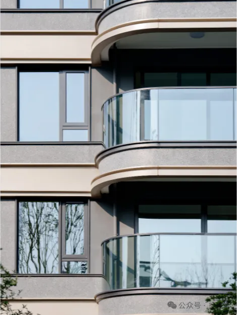 通過不同涂料和不同線腳之間的組合,既能表達我們賦予建筑的現(xiàn)代化屬性,也呈現(xiàn)給居住者更為細膩的居住體驗。 中鐵建·西派璟悅整體建筑形體采用極簡的設(shè)計語言,強調(diào)舒展的橫線線條,運用了轉(zhuǎn)角、切割、圓弧等復(fù)雜的程序,顛覆傳統(tǒng)住宅立面的平鋪直敘,玻璃、曲線鋁板線條組成靈動的轉(zhuǎn)角陽臺,在統(tǒng)一的序列中尋找自然的律動與和諧。