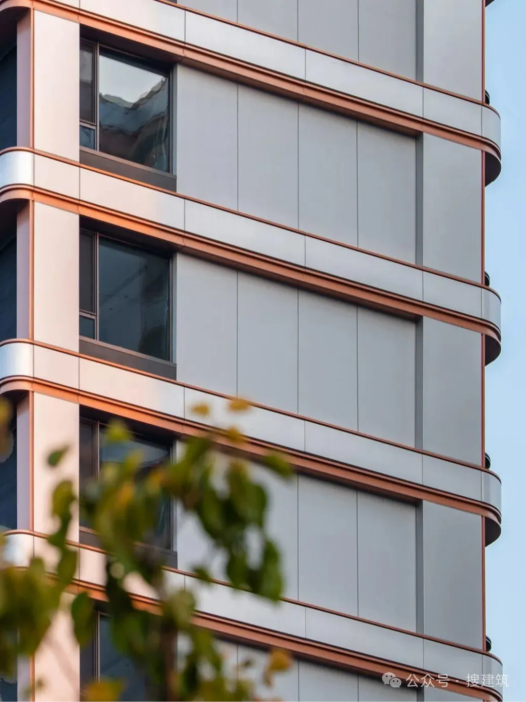 建筑立面主要采用香檳金鋁板與淺灰色水包水仿石涂料,局部多色澤處理增加立面趣味,材料的輕盈與結(jié)構(gòu)的自由流動相得益彰。光影之下,呈現(xiàn)出建筑的柔和立的特質(zhì)。