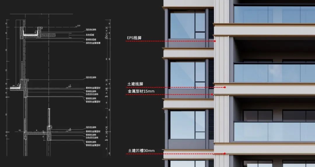 比如西安中鐵建·西派宸樾立面元素組成:暖灰色真石漆與深灰色真石漆相搭配,真石漆窗檻墻部分(橫向線條)采用30mm縫寬分縫, 窗間部分采用8mm分縫。