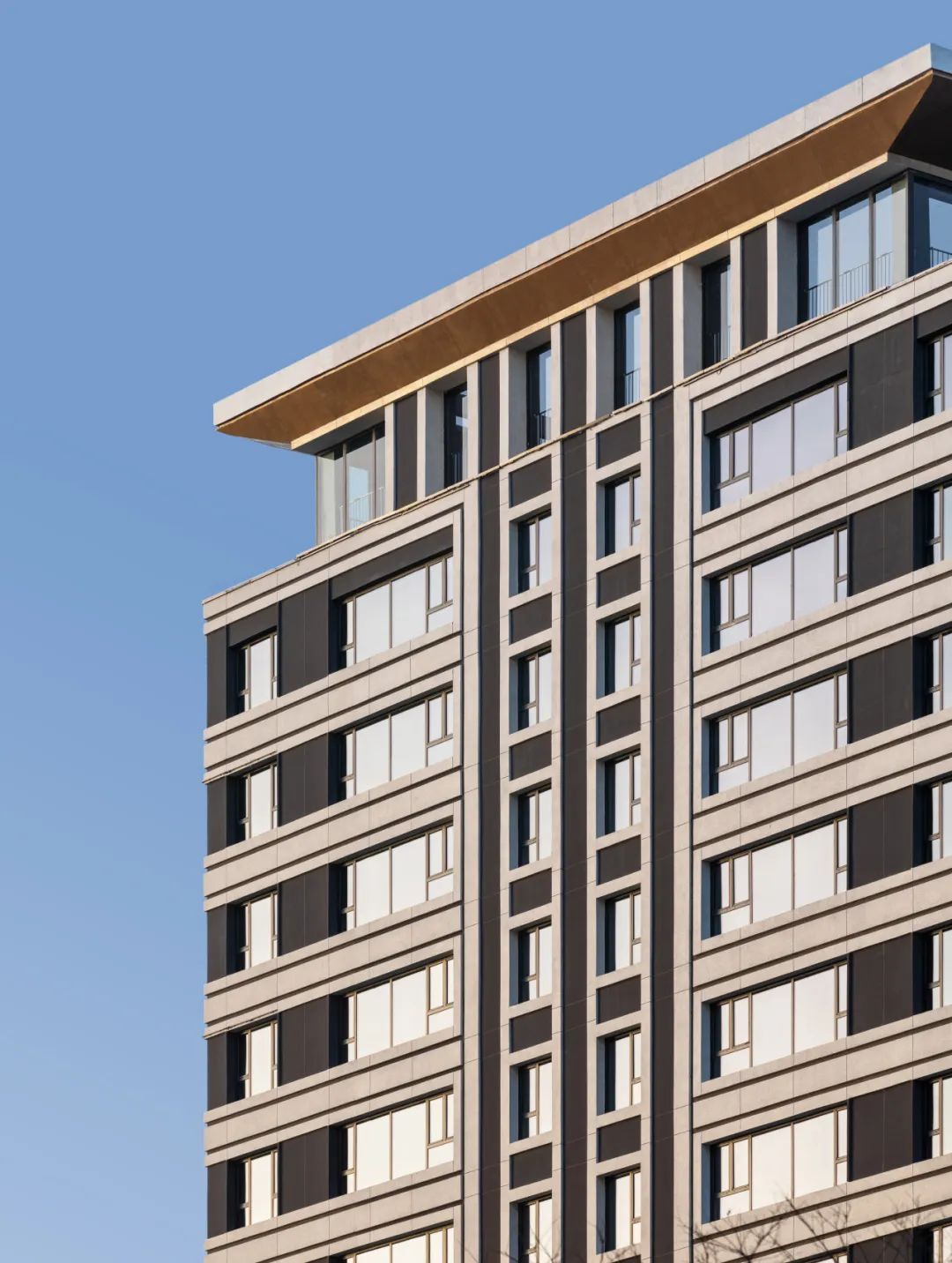西安中糧·奧體壹號外立面標(biāo)準(zhǔn)段的主材采用了灰白色真石漆與深灰色質(zhì)感涂料的組合,互為調(diào)和,通過深與淺形成的虛實對比達成達成清晰明確的立面線條構(gòu)成關(guān)系,簡潔明快而不失典雅。