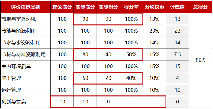 嚴格來講,上述“各類指標得分”和“總得分”實際上都是“得分率”。因為建筑的情況多樣,各類指標下的評價條文不可能適用于所有的建筑,對某一棟具體的被評建筑,總有一些評價條文不能參評。因此,用“得分率”來衡量建筑實際達到的綠色程度更合理。