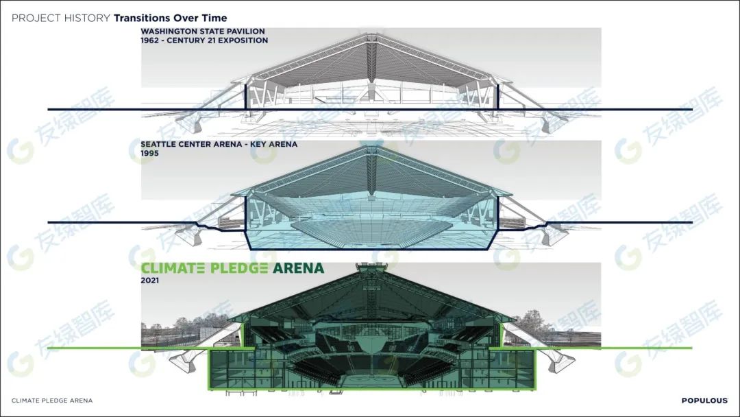 Climate Pledge Arena 由建筑公司 Populous 設計,其歷史可以追溯到 1962 年世界博覽會。