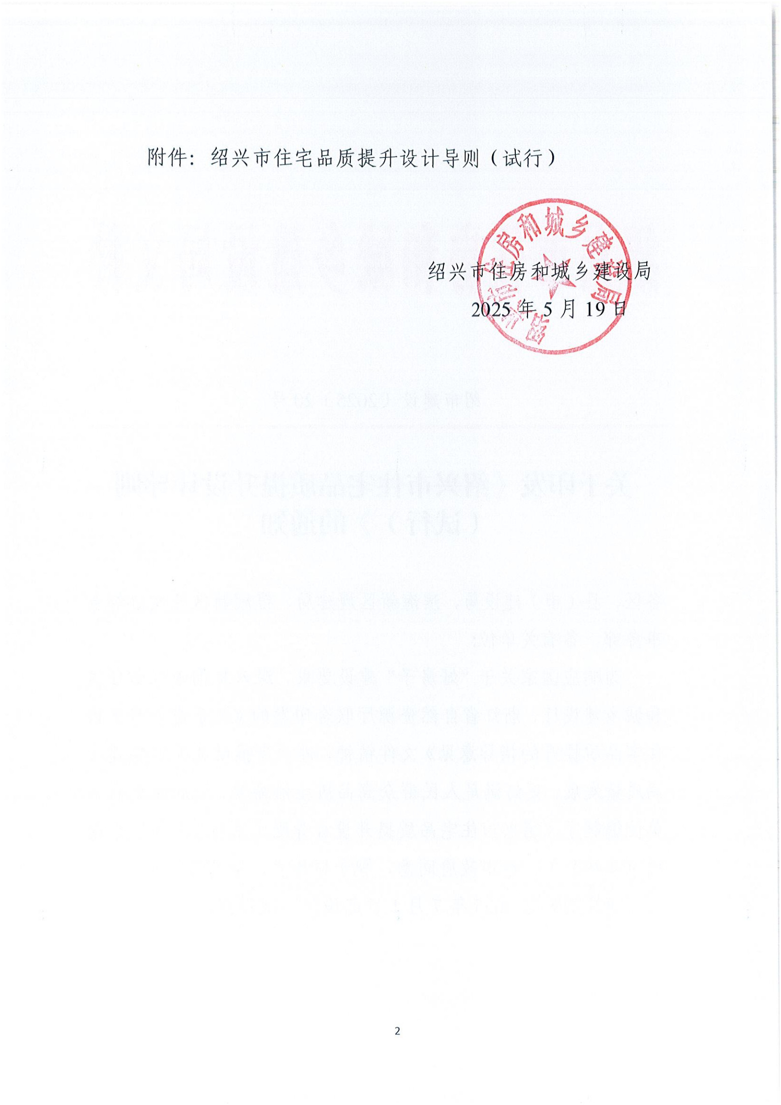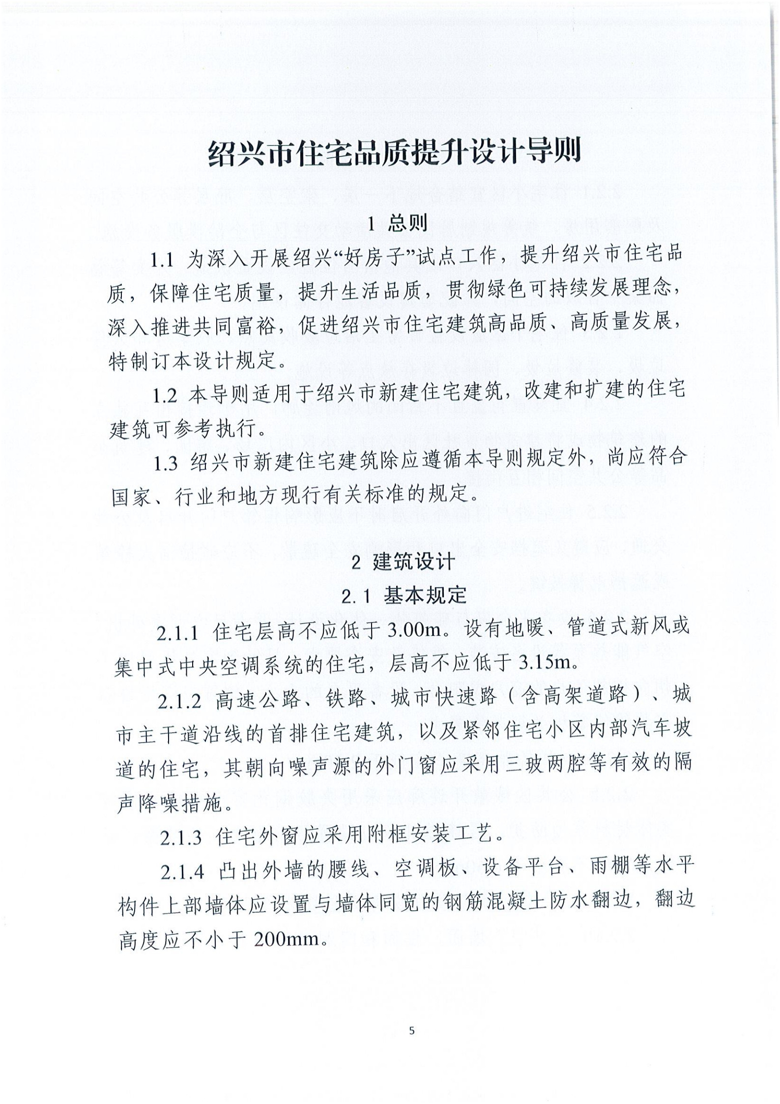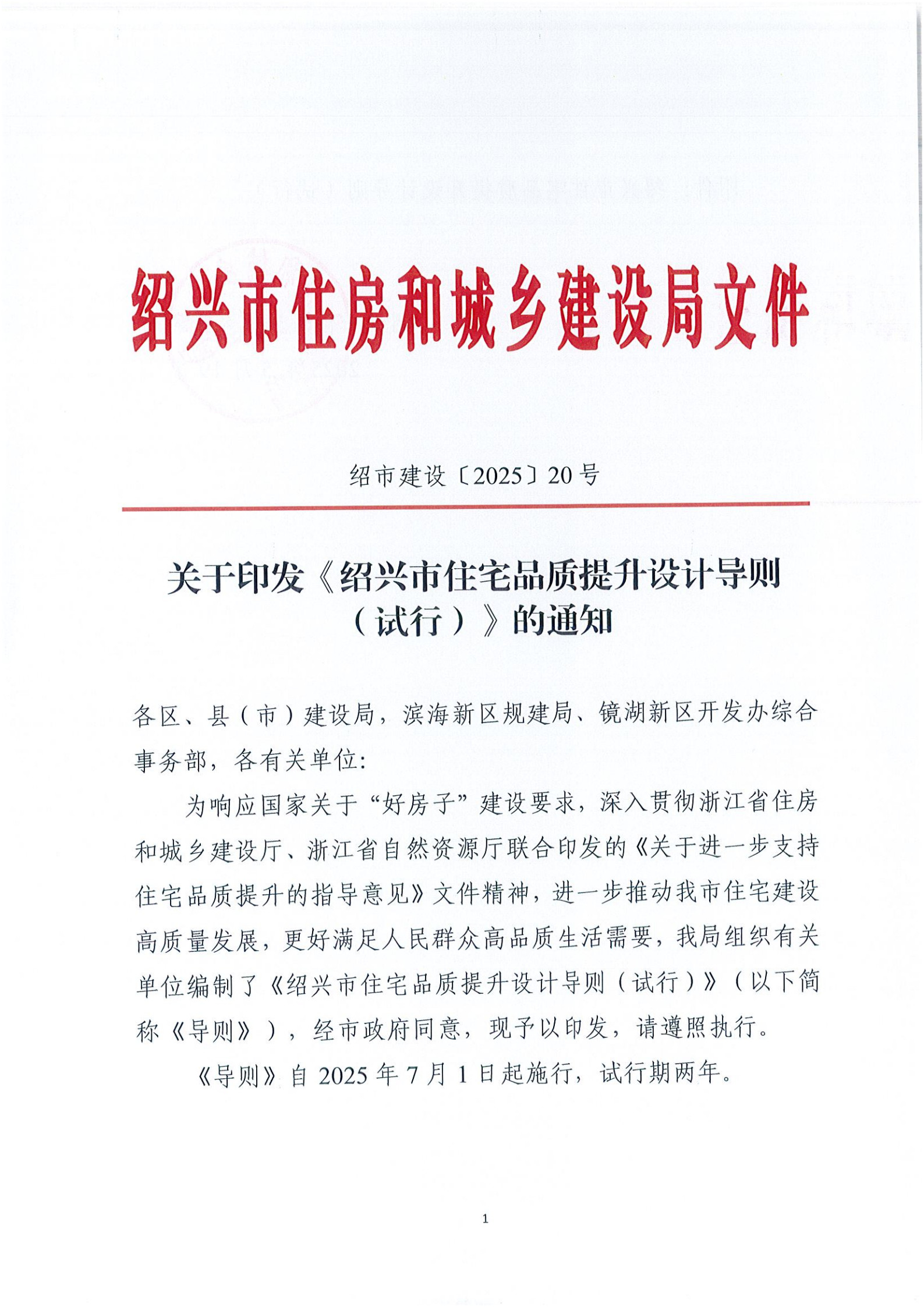 時間:2025-05-22 16:10:21 作者:GBWindows 來源:行業網站 閱讀:556內容摘要:導讀2025年05月19日,紹興市住房和城鄉建設局牽頭制定《紹興市住宅品質提升設計導則》,旨在從設計源頭提升住宅品質,打造安全、舒適、可持續的居住環境。詳情如下↓關于印發《紹興市住宅品質提升設計導則(試行)》的通知各區、縣(市)建設局,濱海新區規建局、鏡湖新區開發辦綜合事務部,各有關單位:為響應國家關于“好房子”建設要...導 讀 2025年05月19日,紹興市住房和城鄉建設局牽頭制定《紹興市住宅品質提升設計導則》,旨在從設計源頭提升住宅品質,打造安全、舒適、可持續的居住環境。