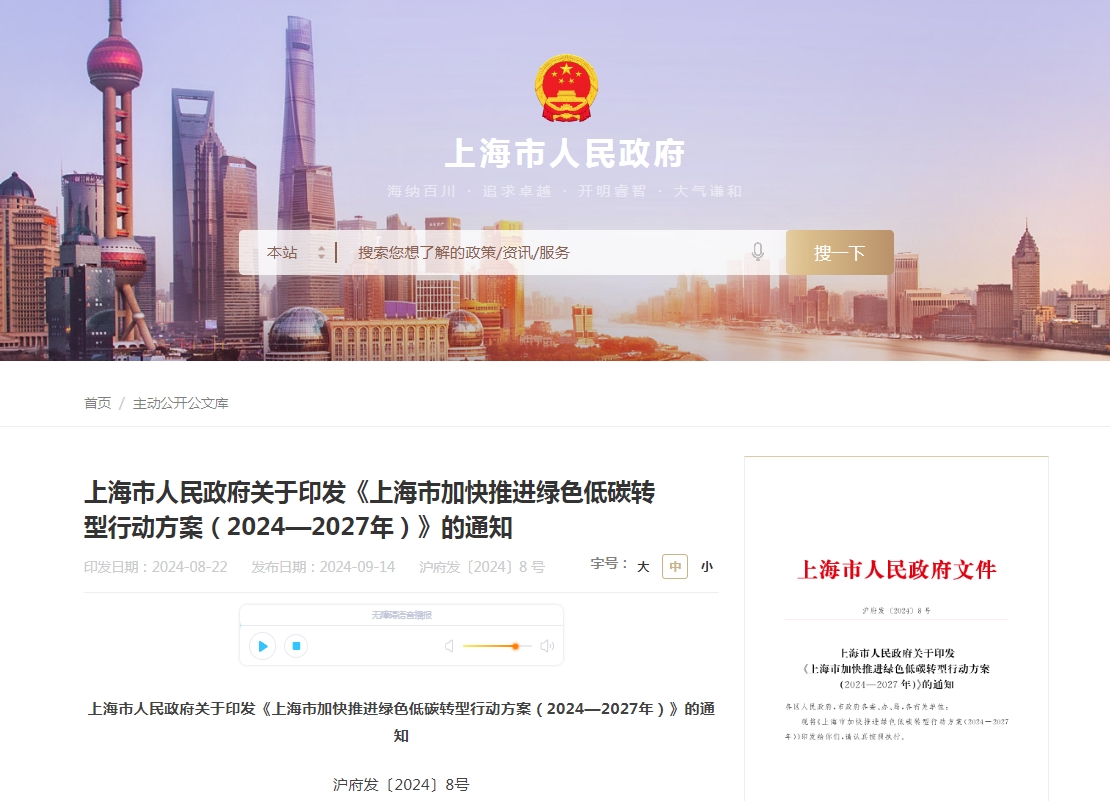 關于印發《上海市加快推進綠色低碳轉型行動方案(2024—2027年)》的通知