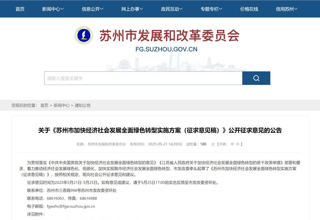 時間:2025-05-27 16:41:13 作者:GBWindows 來源:原創文章 閱讀:551內容摘要:關于《蘇州市加快經濟社會發展全面綠色轉型實施方案(征求意見稿)》公開征求意見的公告為貫徹落實《中共中央國務院關于加快經濟社會發展全面綠色轉型的意見》《江蘇省人民政府關于加快經濟社會發展全面綠色轉型的若干政策舉措》部署和要求,著力推動經濟社會發展綠色化、低碳化,加快實現我市經濟社會發展全面綠色轉型,市發改委牽頭起草了《蘇...