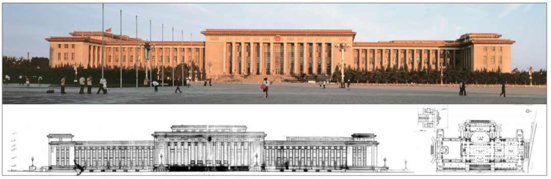 圖2 人民大會堂實景照片、東立面、一層平面圖(來源:上:楊超英 攝,下:《人民大會堂專輯》 建筑創作)