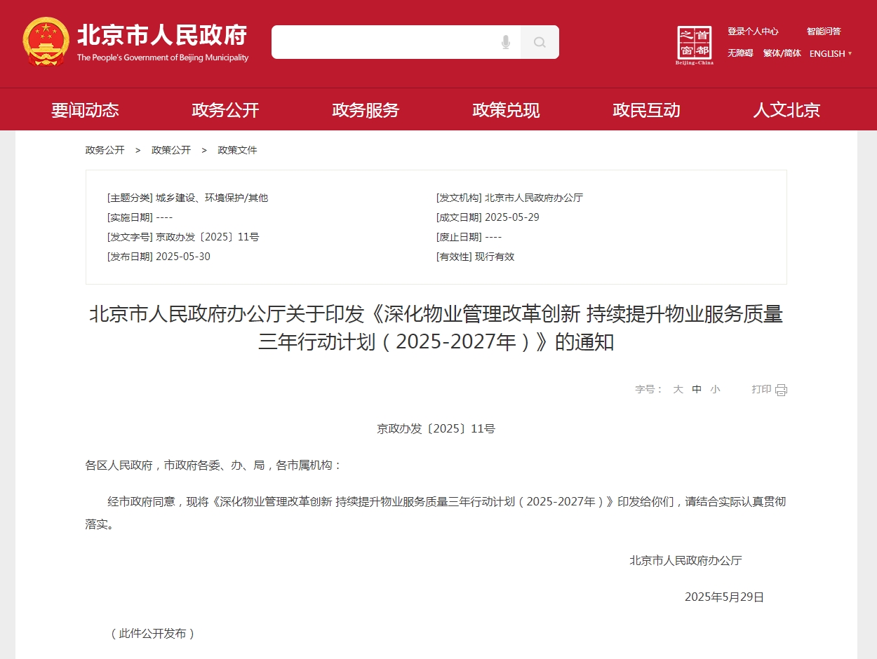 北京市人民政府辦公廳關于印發《深化物業管理改革創新 持續提升物業服務質量三年行動計劃(2025-2027年)》的通知
