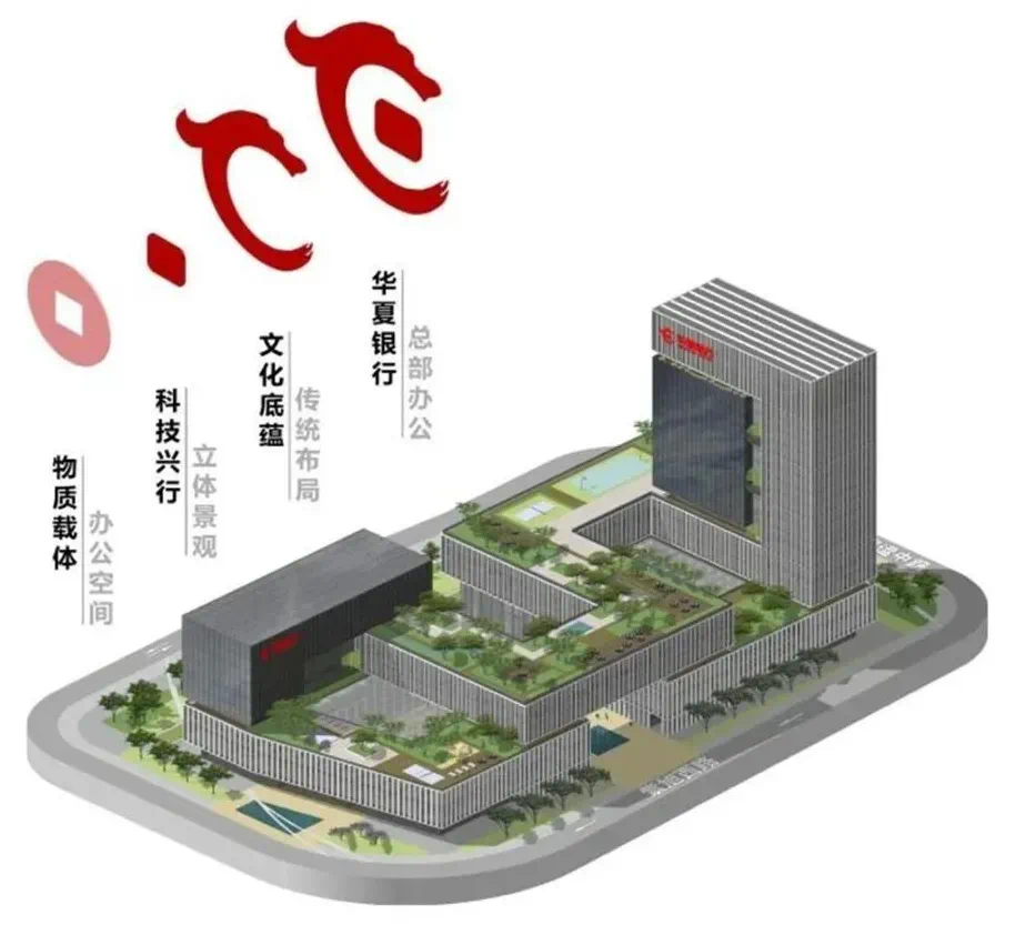 該大樓設計理念從華夏銀行標識原型紅山玉龍形象中提煉出“C型雷紋”布局,建筑總平面以“C型雷紋”為靈感,高效利用場地,形成南、北、中三組圍合式庭院空間。中央軸線巧妙串聯園區、西側城市空間及環繞建筑的C形總部公園。
