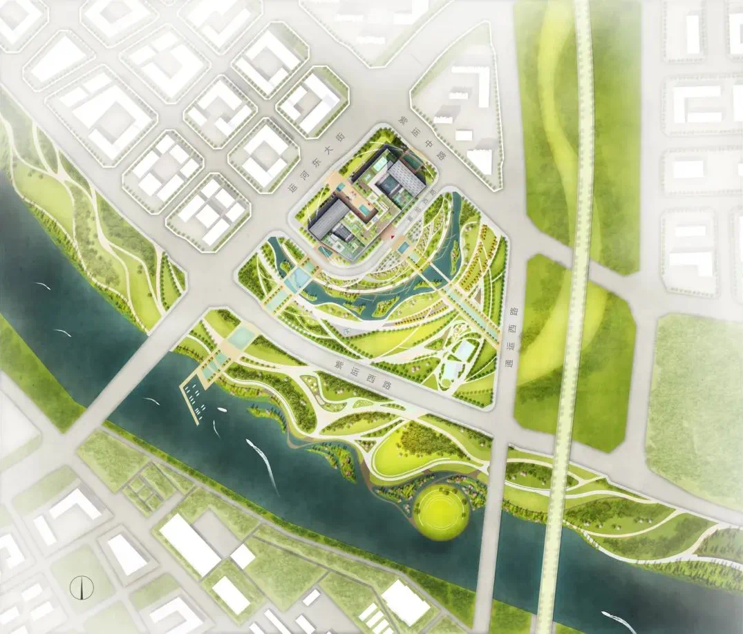 北側百米主塔與西側副塔呈交錯L型布局,勾勒出面向東南公園與運河水岸的靈動天際線。建筑最大亮點在于大面積集成光伏幕墻與光伏屋頂。