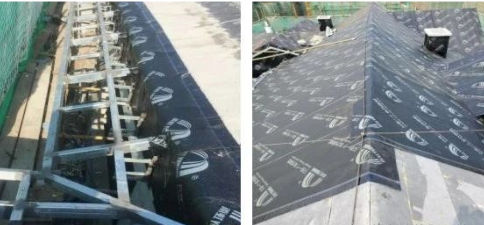 坡屋面壓光成活(左),刮涂BH2防水油膏