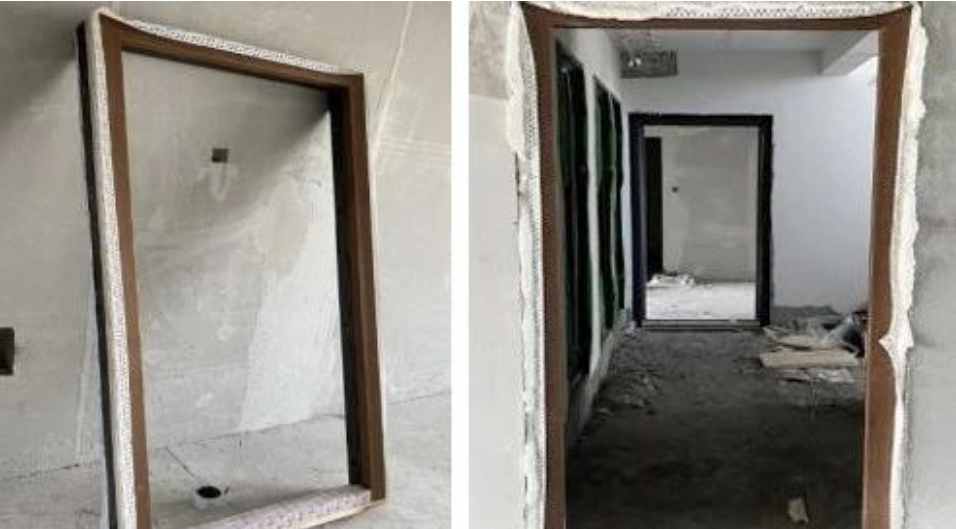 門框進場集中粘貼隔氣膜(左),門框依控制線安裝
