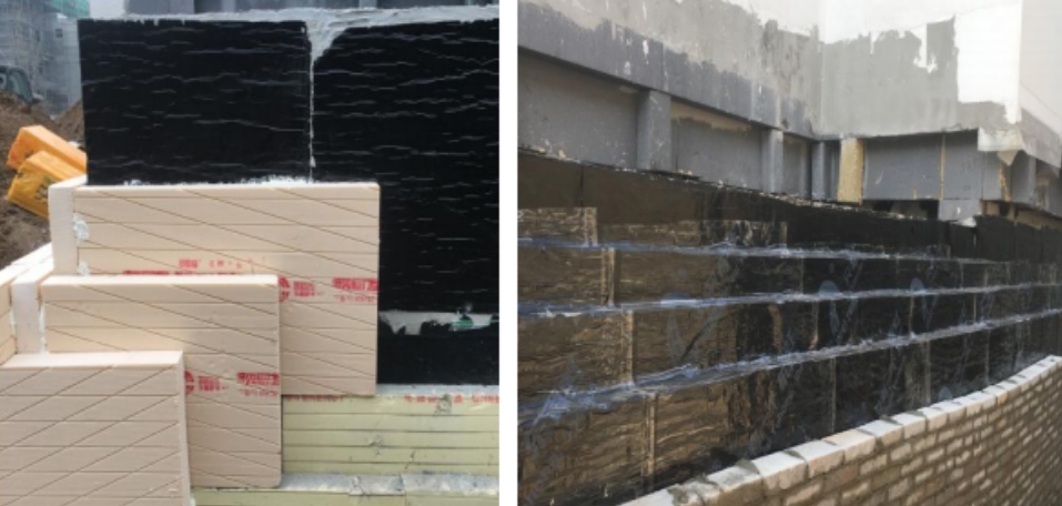 ±0.000至-1.000范圍保溫板錯縫粘貼(左),防水卷材將保溫板全部粘貼密封,外側砌筑防護墻體